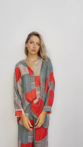 We call this flowy shirt our ZigZag Blouse. The print is so colourful that it will easily sit back with many bottoms in your Spring Wardrobe.