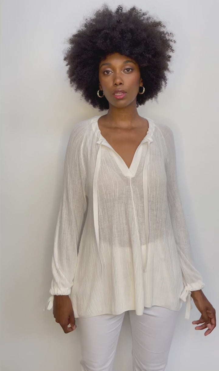 Tie neck and tie cuffs make this top extra special so does the textured pattern throughout the garment.